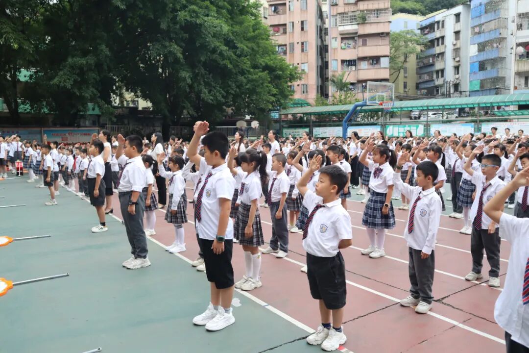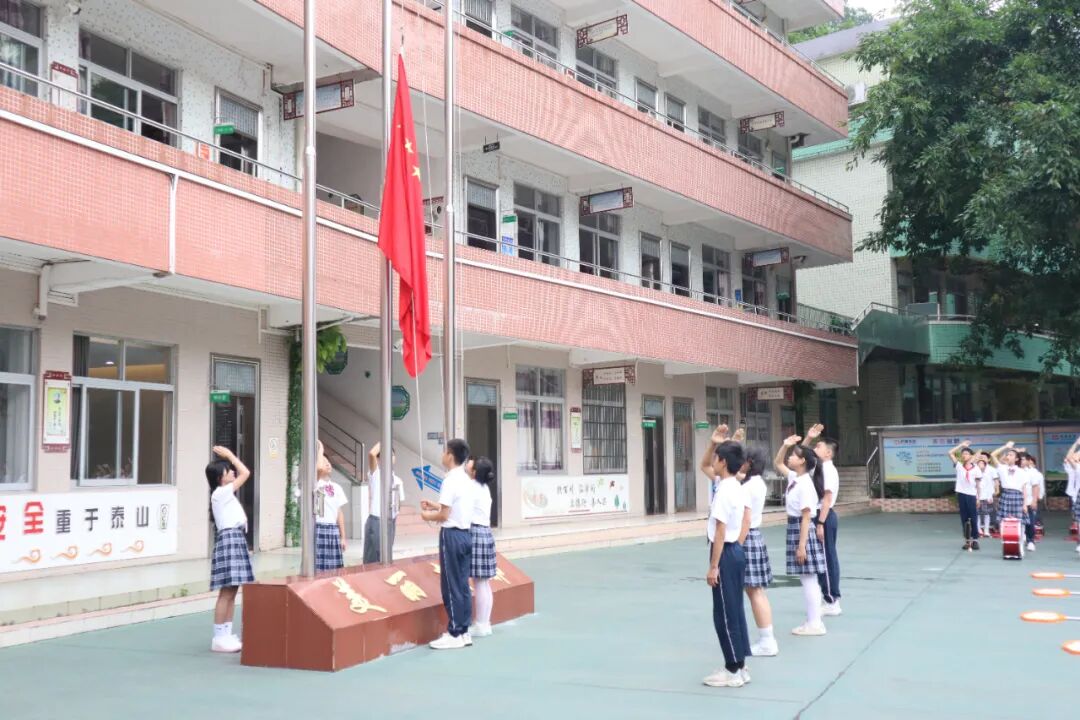 雄壮的国歌声响起,五星红旗缓缓升起,全体少先队员面向国旗行队礼。坚毅的眼神中透露着对祖国的热爱和崇高敬意。
