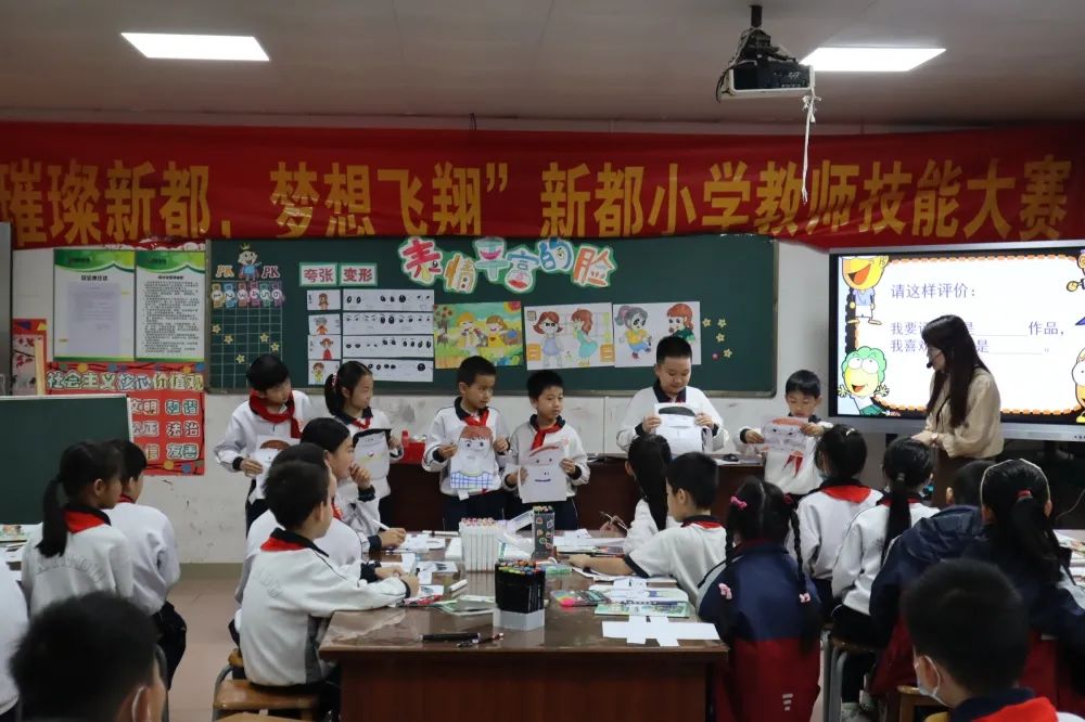 美术课上,黄丹老师采用互动游戏,成语猜猜猜,结合语境场景,引导学生观察人物不同的表情特点,再进行美术创作、表演和展示,并鼓励学生运用夸张和变形的艺术表现手法创作自己的作品。