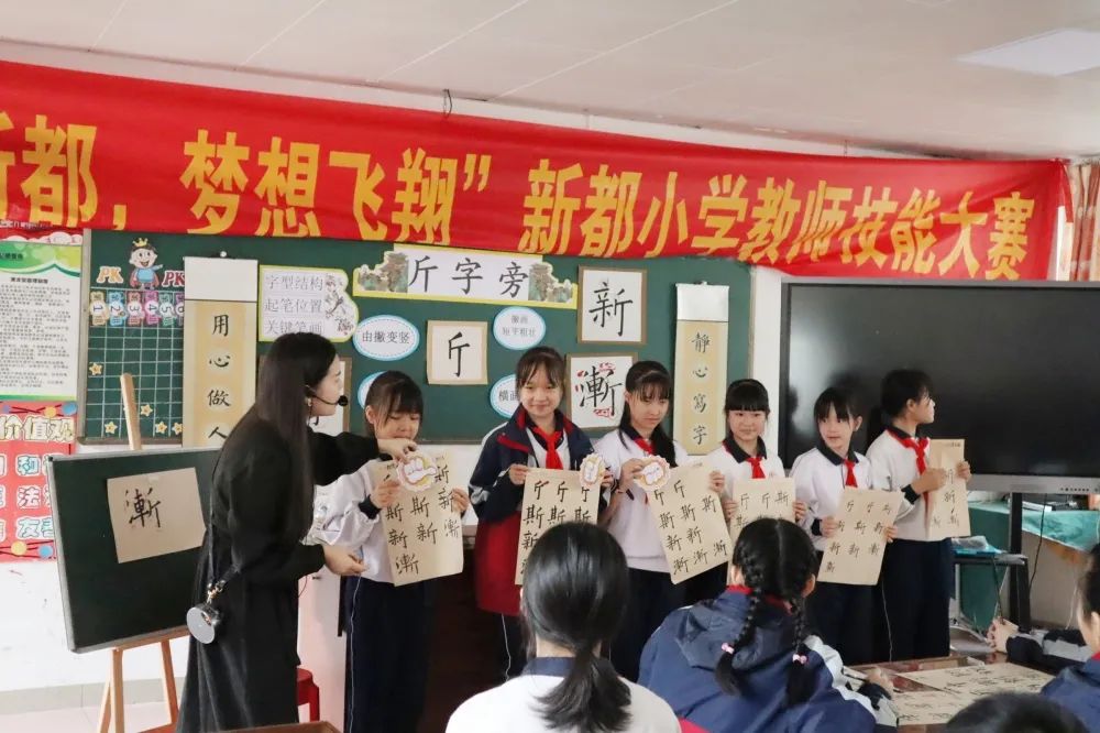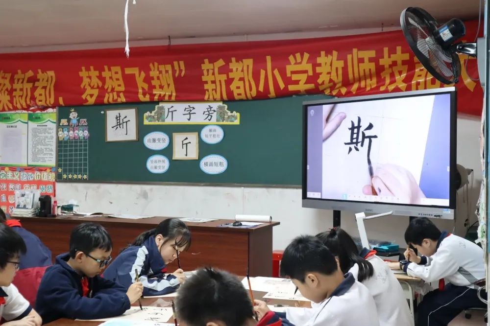 在蔡坤老师的书法课堂上,通过古诗欣赏、手势舞表演、读字帖、实践书写等环节让学生掌握斤字旁及例字的书写,轻松一刻:《写好中国字手势舞》使书法课堂变得生动有趣。
