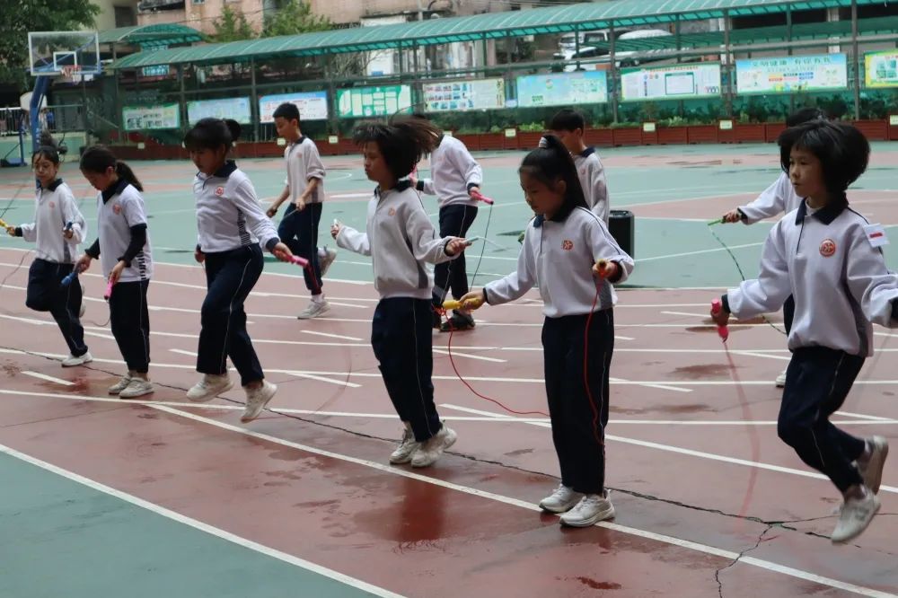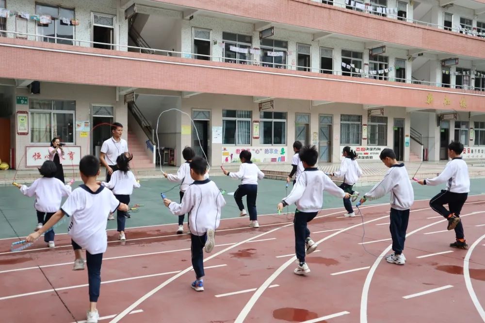 每人一根跳绳,并脚左右跳,前后转换跳、、、、、、一次,两次,三次。一根小小的跳绳,承载的是努力与汗水;一根小小的跳绳,传递的是拼搏与勇气。