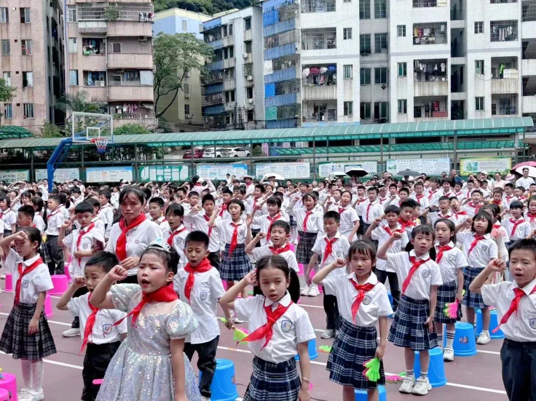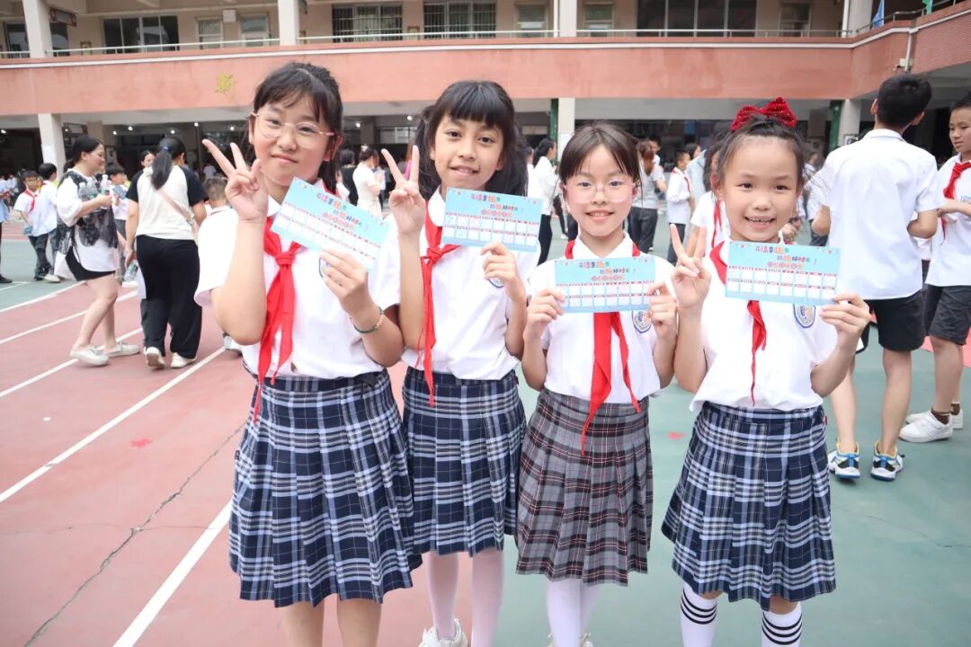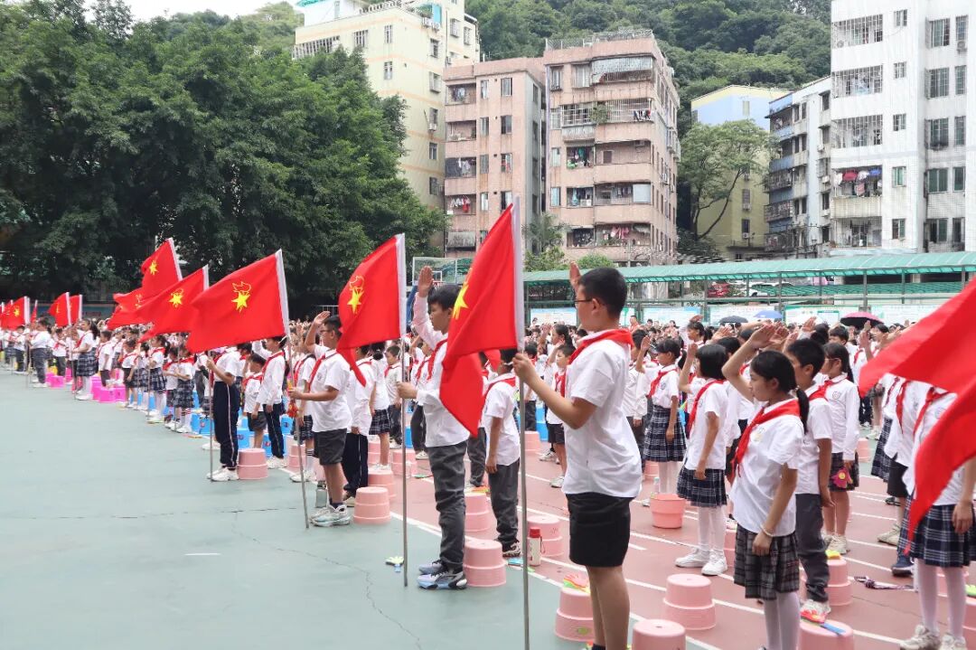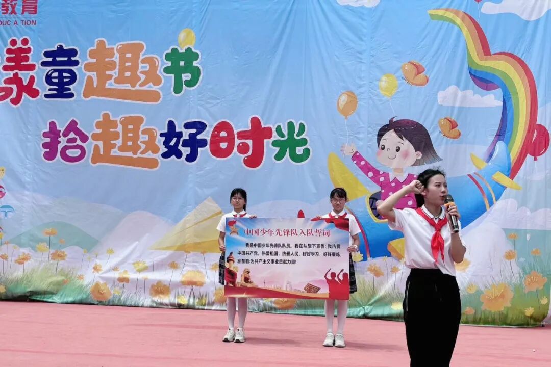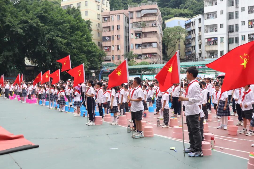 大队辅导员郑老师宣读了新队员的名单。在师生的共同见证下,校领导和六年级老队员为新队员戴上了鲜艳的红领巾。新队员个个精神饱满、神情庄重,满怀着对中国少年先锋队的期待和向往。从此刻起,他们便有了新的称号——少先队员;他们也有了新的组织——中国少年先锋队。