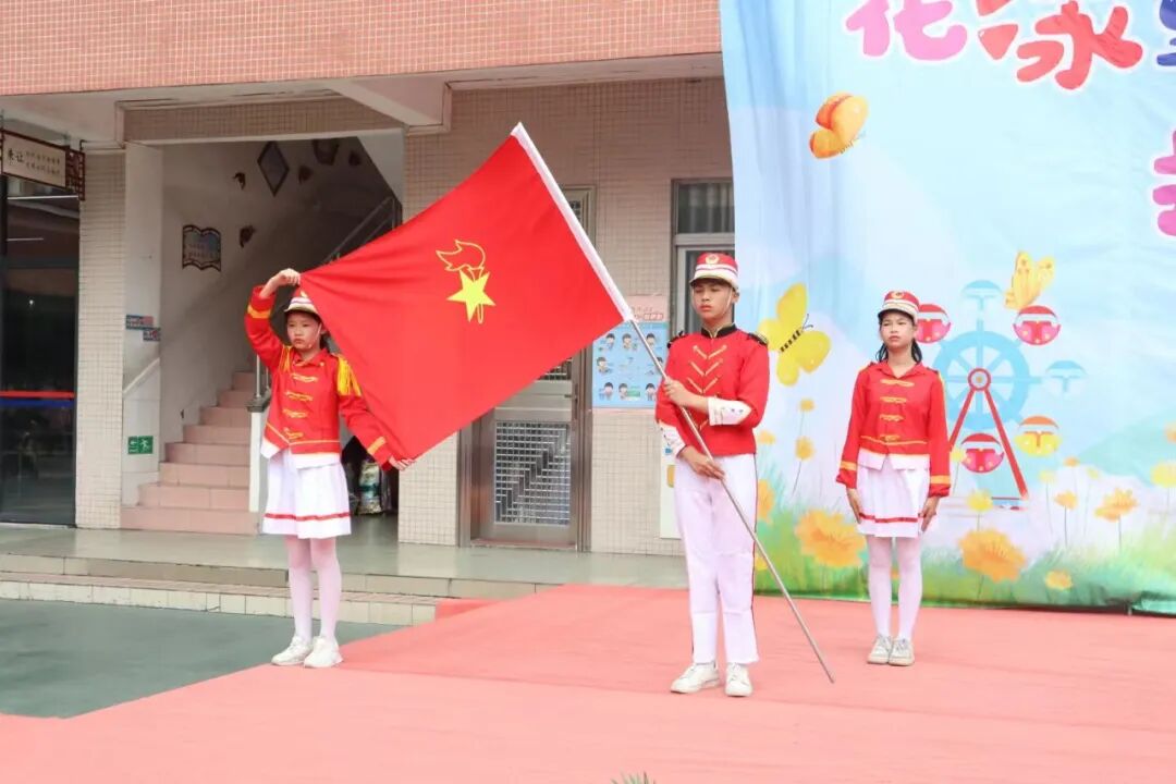 出旗手、护旗手踏着整齐、坚定且自信的步伐向前迈进。鲜艳的队旗高高飘扬,指引大家前进的方向。