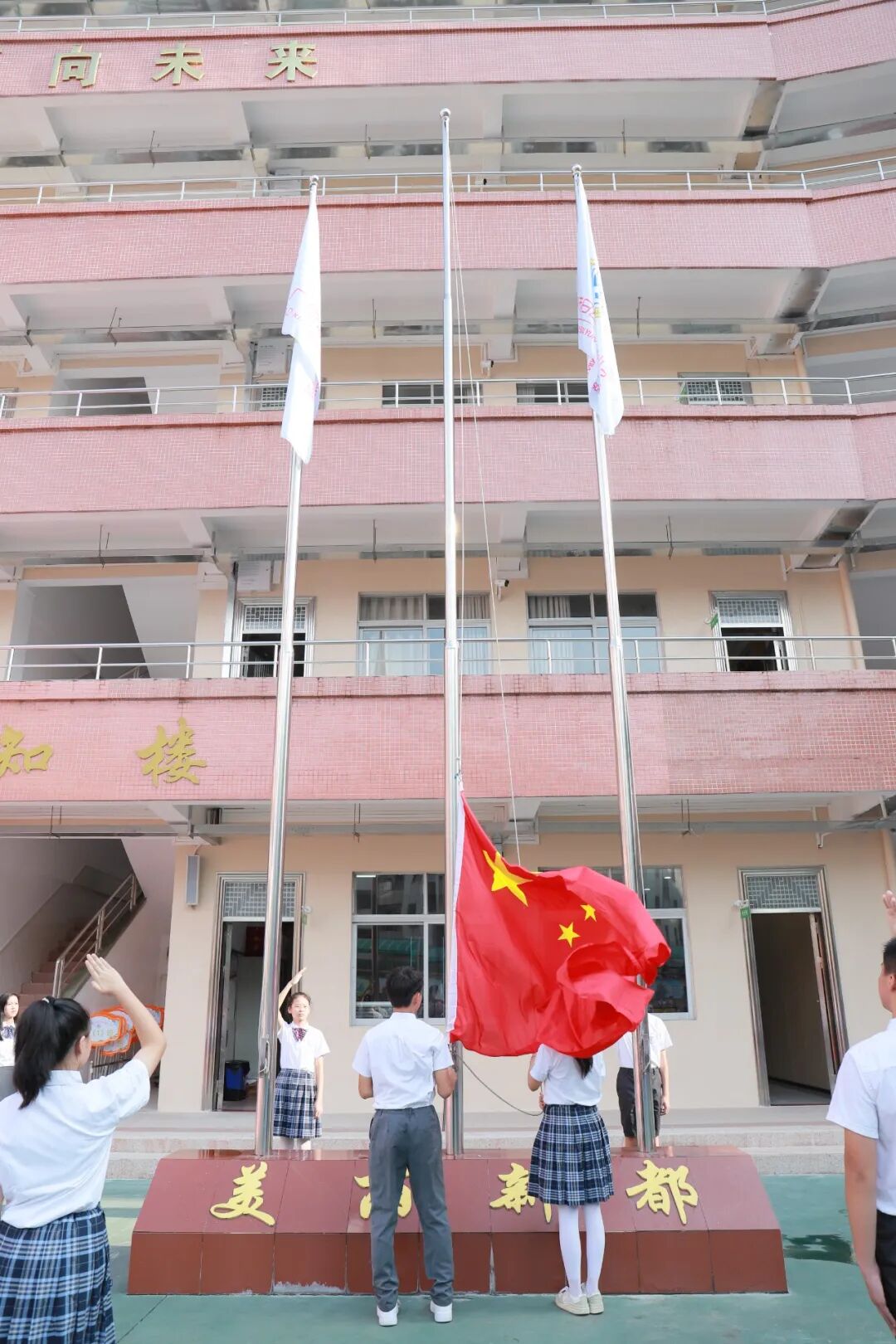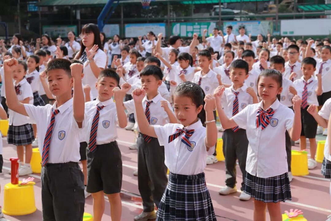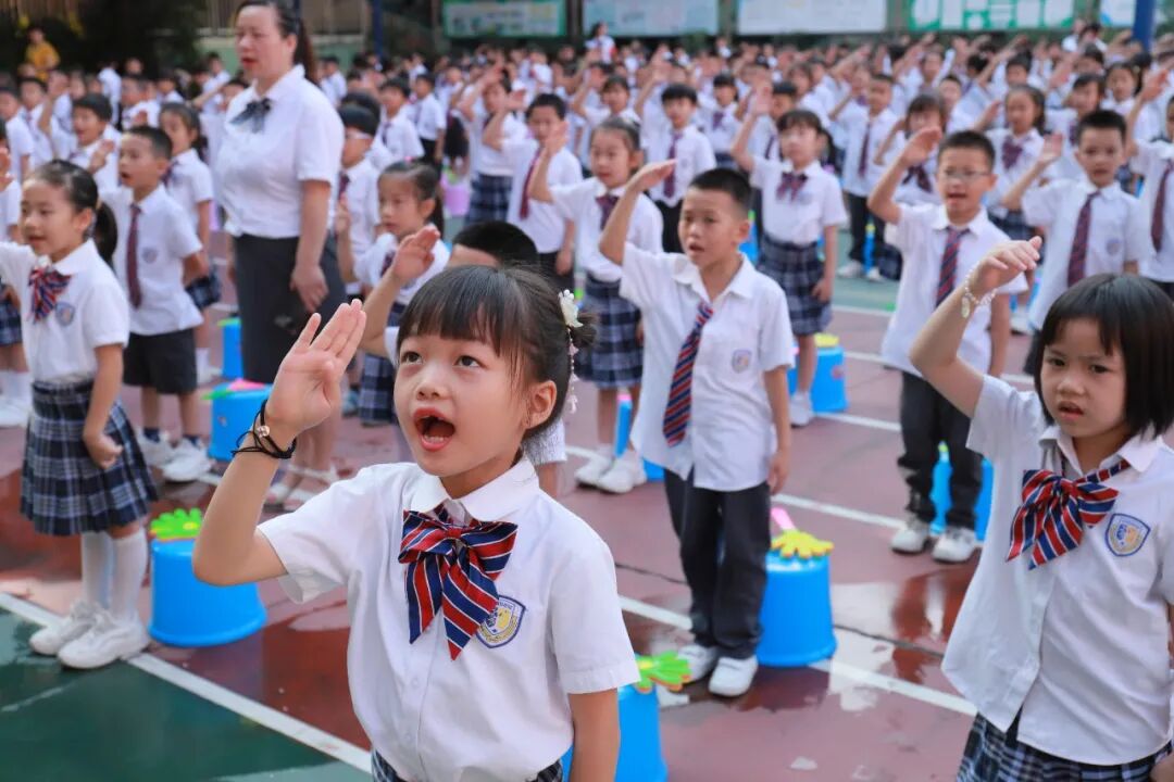 激扬的音乐响起,伴随着一声响亮的“出旗”,国旗护卫队的同学迈着铿锵有力的的步伐走向升旗台。庄严的国歌奏响,全体肃立,行注目礼,五星红旗冉冉升起。老师和孩子们共唱国歌,与激昂的旋律编织出一幅动人的画面。