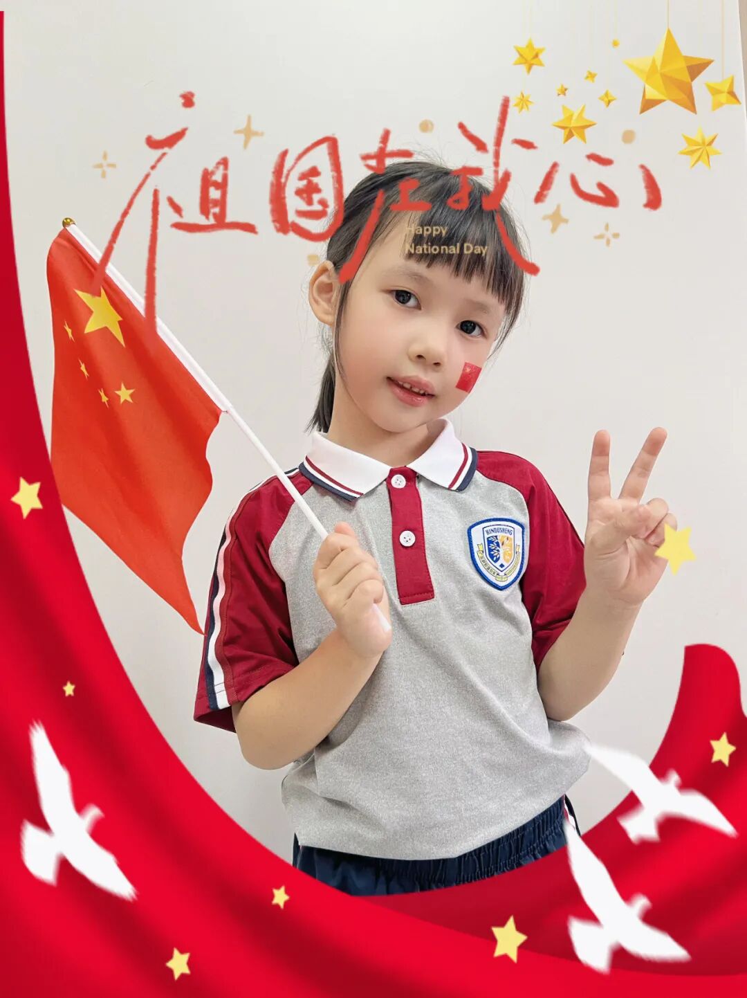 在鲜红旗帜的映照下,他们一张张幸福的笑脸是对祖国最美的祝福,心怀报国志,倾诉爱国情。看!一、二年级中队创意十足,精心设计的合影,传递着“我爱你,中国”的心声。