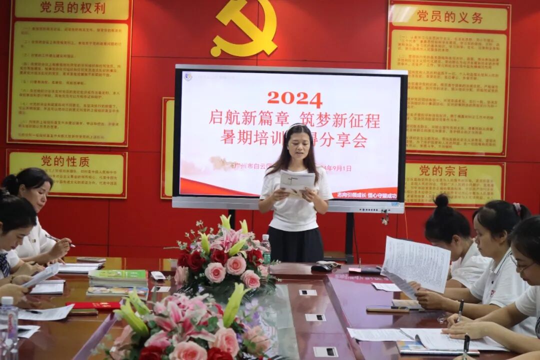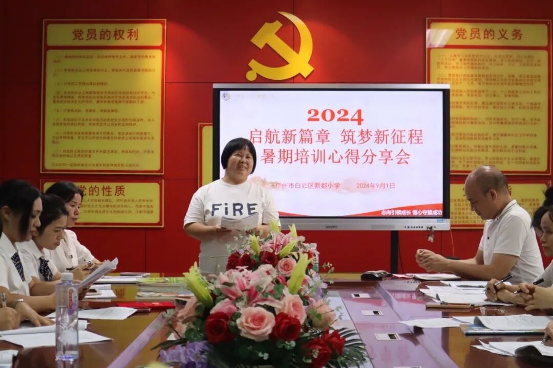 白云区新都小学全体教师在党建办汇聚一堂,各个科组分别派老师代表进行暑期教师培训学习心得的分享。